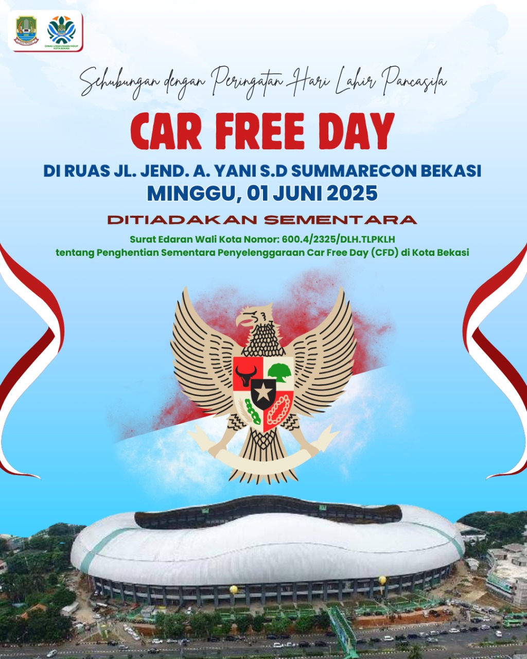 Kegiatan ini ditiadakan khusus pada hari Minggu, 1 Juni 2025, sehubungan dengan pelaksanaan Upacara Peringatan Hari Lahir Pancasila Tingkat Kota Bekasi Tahun 2025 yang akan digelar di Plaza Kantor Pemerintah Kota Bekasi pada hari yang sama.