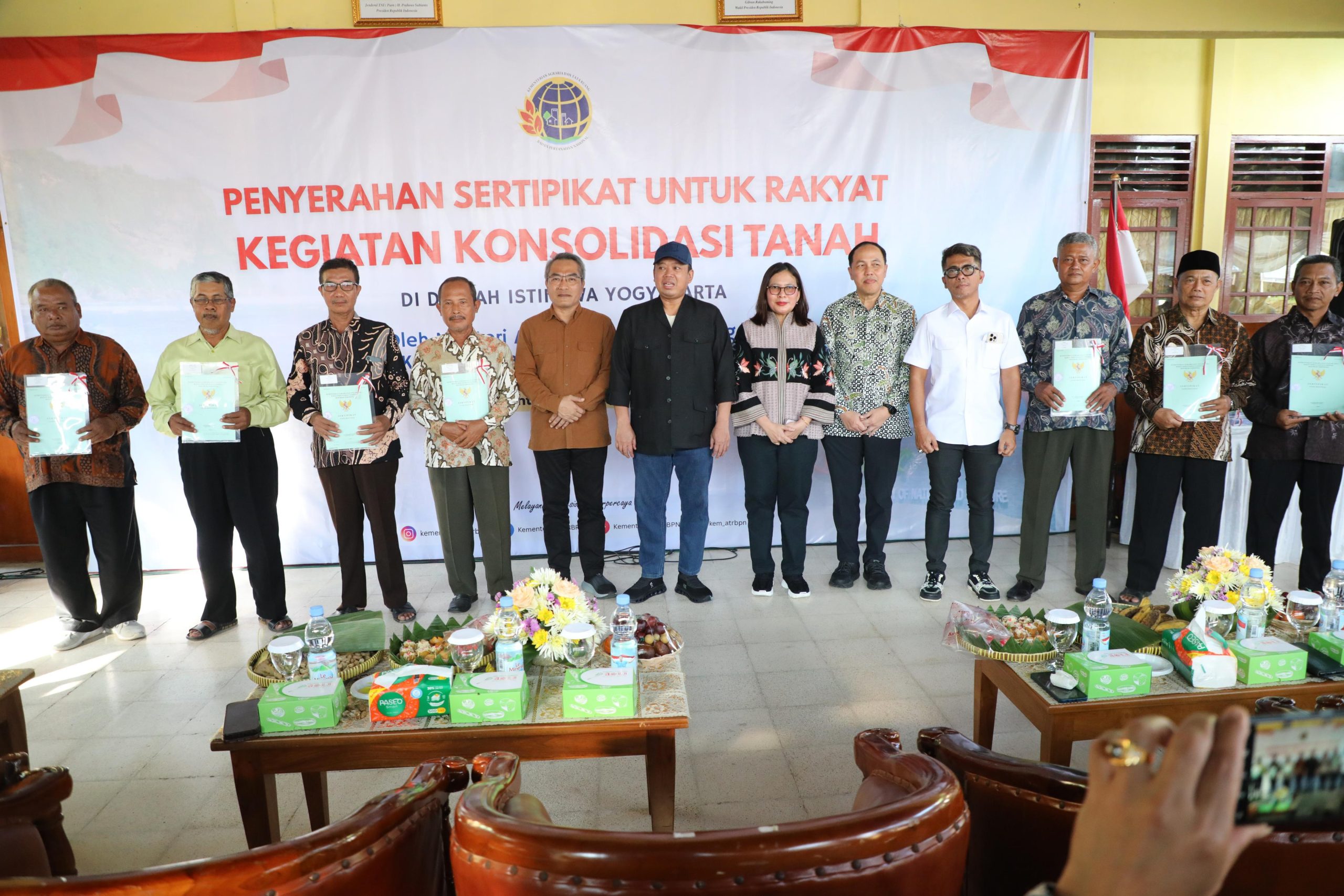 Saat menyerahkan sertipikat, Menteri Nusron didampingi oleh Bupati Bantul, Abdul Halim Muslih; Direktur Jenderal Pengadaan Tanah dan Pengembangan Pertanahan, Embun Sari; Staf Khusus Bidang Komunikasi Strategis dan Kerja Sama Antarlembaga, Muda Saleh; dan Kepala Kantor Wilayah BPN Provinsi D.I. Yogyakarta, Dony Erwan Brilianto.