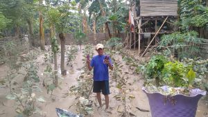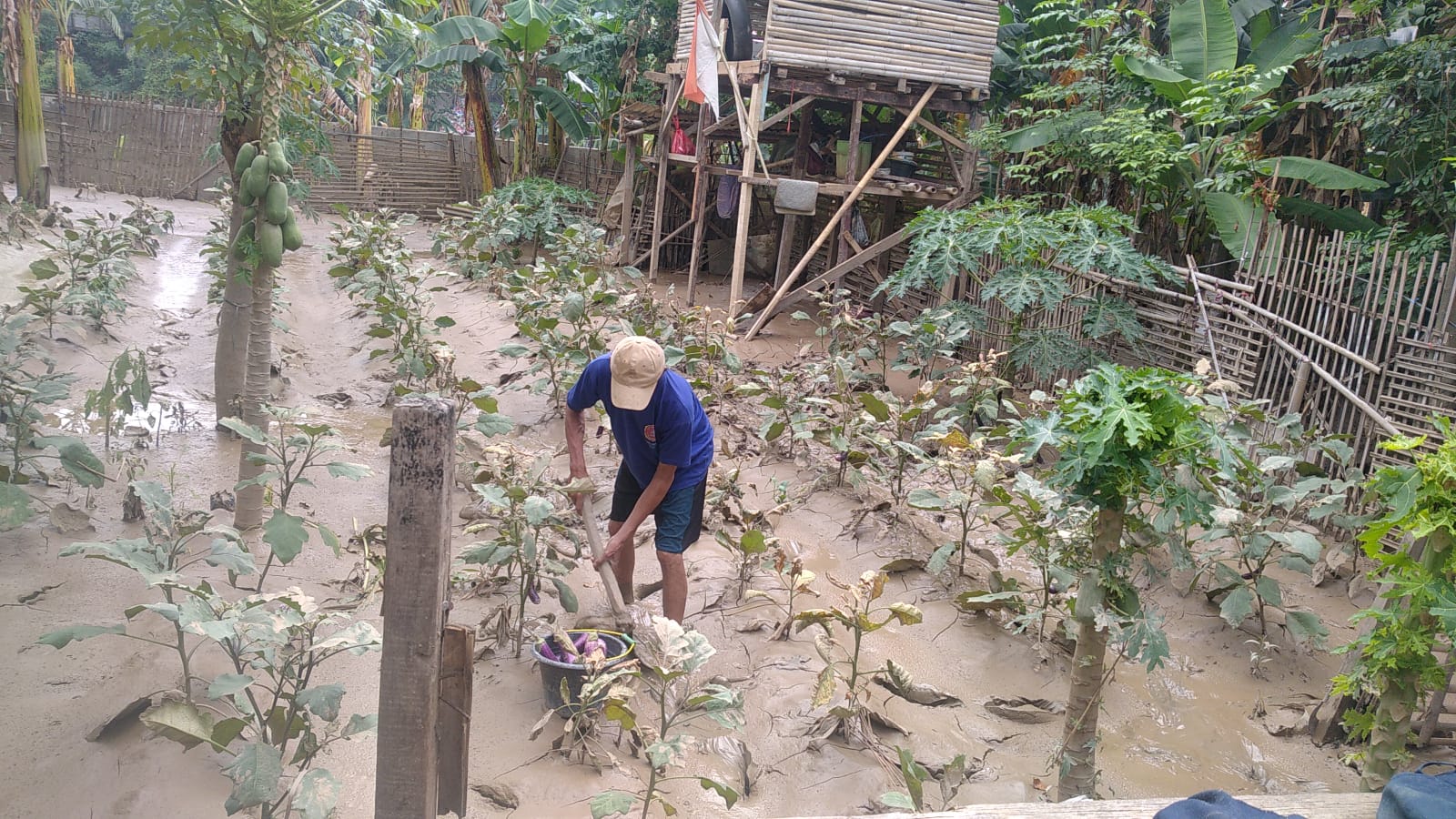 Seorang petani terong, Samsuri (60) mengatakan bahwa banjir menenggelamkan kebunnya, yang sebentar lagi seharusnya sudah bisa dipanen.