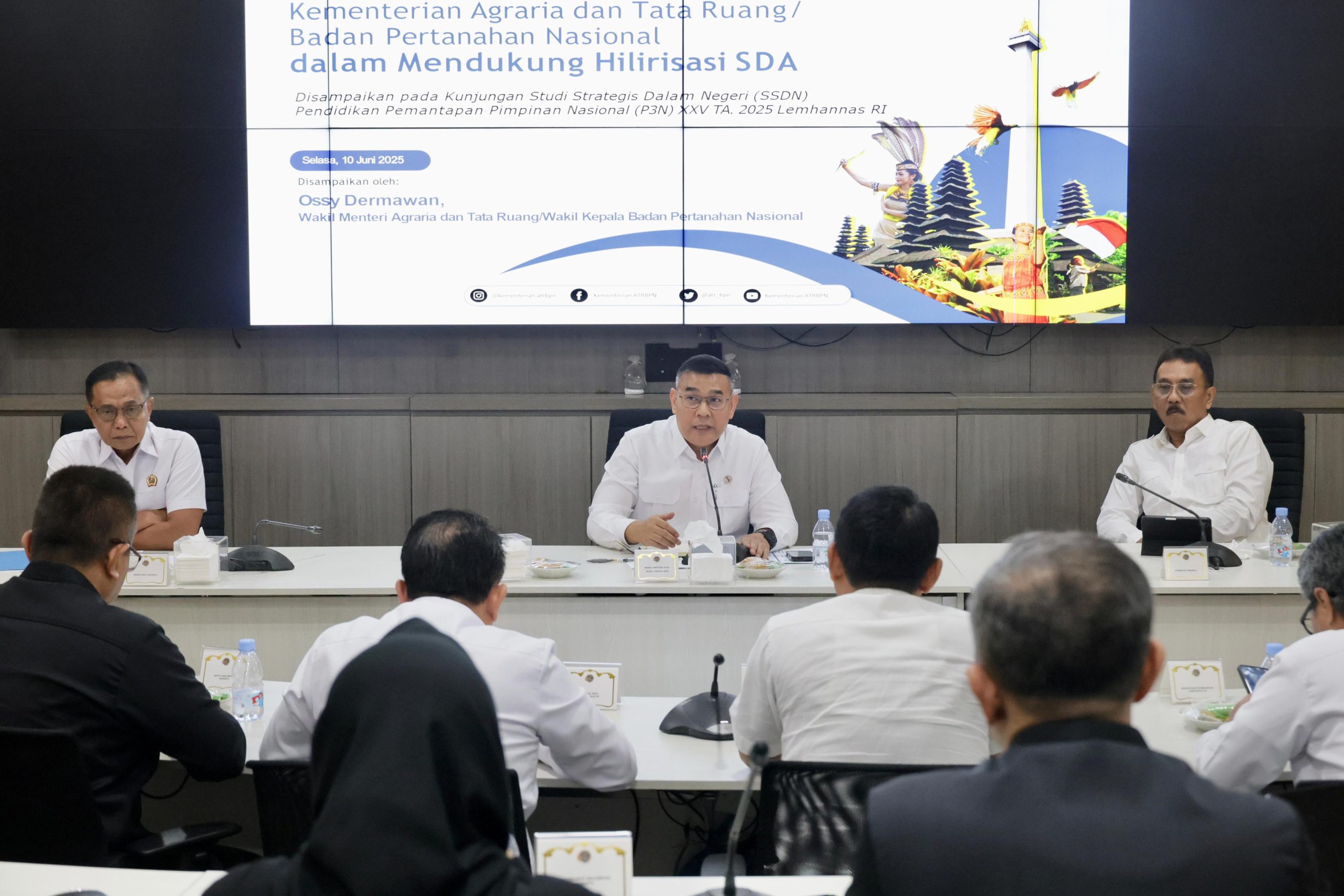 Rotasi.co.id – Wakil Menteri Agraria dan Tata Ruang/Wakil Kepala Badan Pertanahan Nasional (Wamen ATR/Waka BPN), Ossy Dermawan, menerima kunjungan Kegiatan Studi Strategis Dalam Negeri (SSDN) Pendidikan Pemantapan Pimpinan Nasional (P3N) Angkatan XXV Tahun Anggaran 2025 dari Lembaga Ketahanan Nasional Republik Indonesia (Lemhannas RI). Kegiatan ini berlangsung di Aula PTSL Kementerian ATR/BPN, Jakarta.